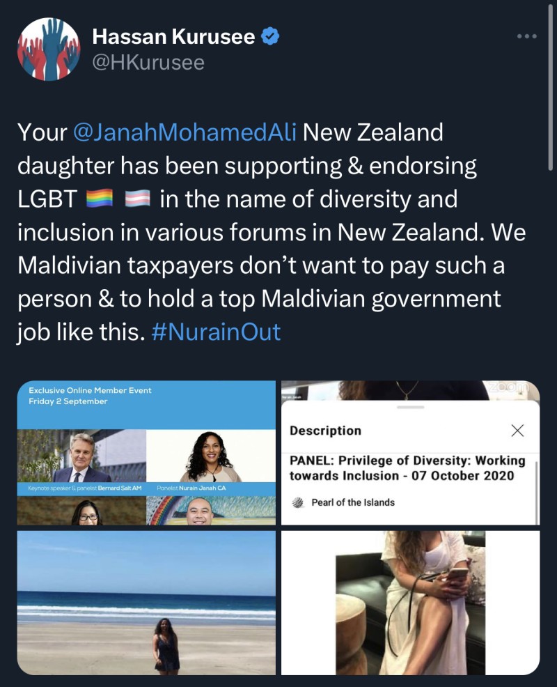 ނިއުޒިލޭންޑުގައި ދިރިއުޅެމުންދާ ނުރައިން ޖަނާހު އަކީ އިޖްތިމާއީ މިންގަޑާއި ހިލާފަށް ހެދުން އަޅައިގެން ސޯޝަލް މީޑިއާގައި ފޮޓޯ ޕޯސްޓު ކުރަމުން އަންނަ ފަރާތެކެވެ. މީގެ އިތުރުން ނުރައިން އަކީ އެލްޖީބީޓީ ޕްރޮމޯޓު ކުރުމަށް ގިނަ މަސައްކަތްތަކެއް ކުރަމުން އަންނަ މީހެކެވެ.